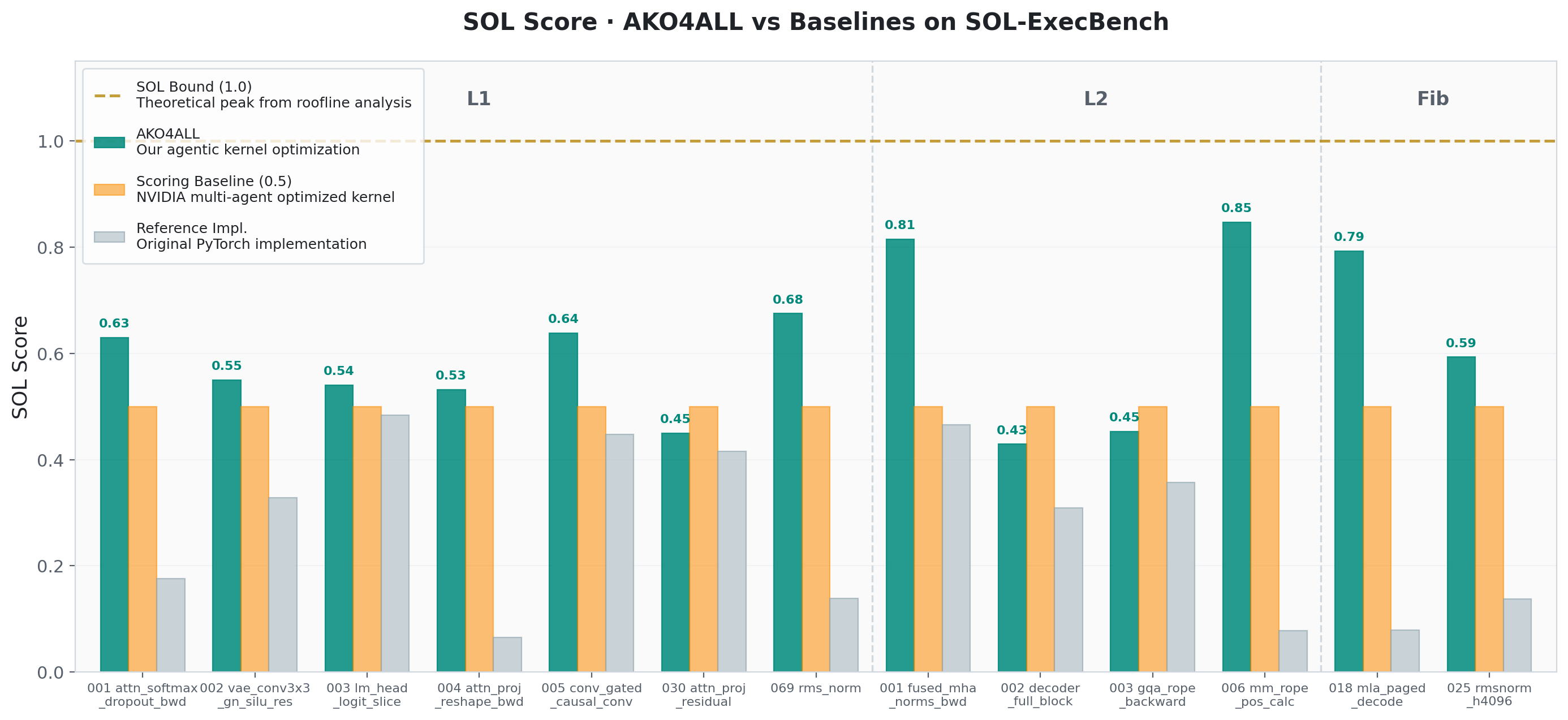 We evaluated AKO4ALL on 13 kernels from SOL-ExecBench (Level 1, Level 2, and flashinfer-bench). 10 out of 13 kernels outperform the Scoring Baseline (NVIDIA multi-agent optimized kernel).